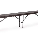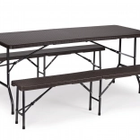 Praktický skládací set pro až 8 osob zahrnuje stůl a dvě lavice s odolným ratanovým vzhledem. Konstrukce z kovu a pevný HDPE zajišťují stabilitu a dlouhou životnost. Set se skládá do kufru s transportními madly, má pojistky proti samovolnému složení a protiskluzové koncovky. Ideální pro zahradní párty, catering i kempování.