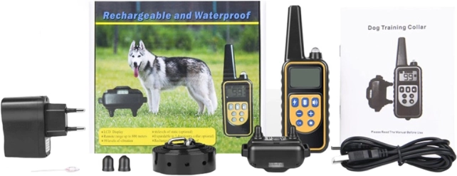 - dálkové ovládání, přijímač, obojek, silikonové krytky, zkušební světlo, USB nabíječka, nabíjecí kabel, příručka, balení