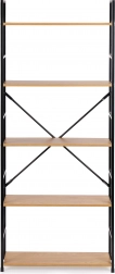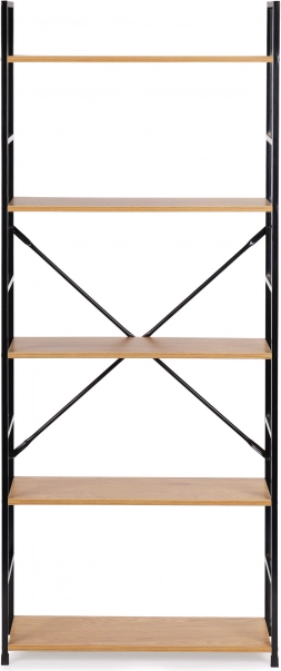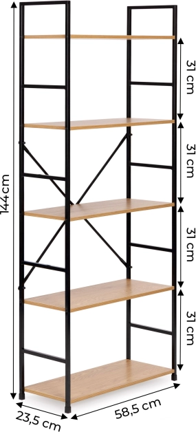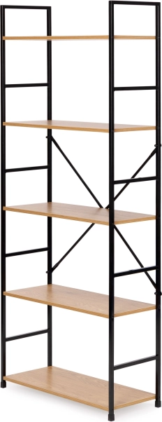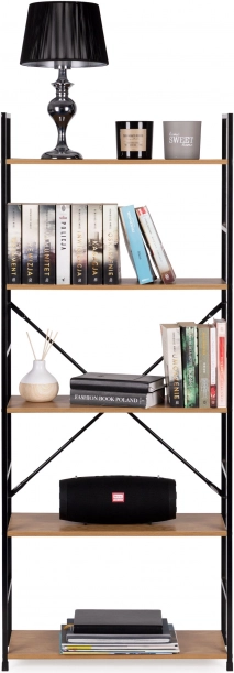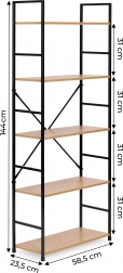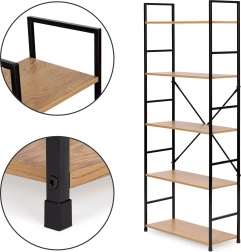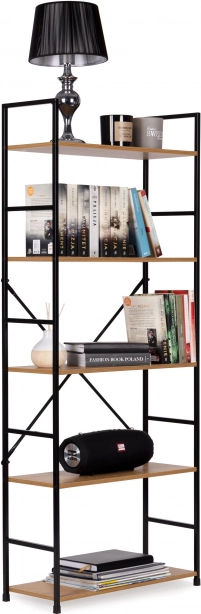 Tato vysoká knihovna je perfektním řešením pro přehledné ukládání i vystavení dekorací. Otevřená konstrukce a pět MDF polic s dekorem dřeva poskytují dostatek místa na knihy, rostliny, svíčky či doplňky. Černý kovový rám s práškovým lakem a křížové výztuhy zaručují dlouhou životnost a stabilitu.