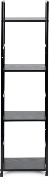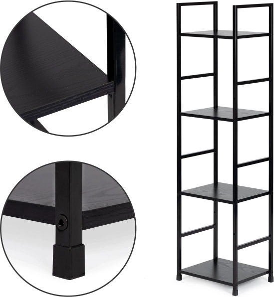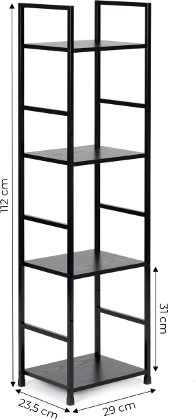 Police z MDF s dekorem dřeva mají rozměr 23,5 × 29 cm a jsou usazeny v práškově lakovaném kovovém rámu z 12mm čtvercových profilů. Nohy jsou opatřeny ochrannými koncovkami proti poškrábání podlahy. Součástí balení je sada pro upevnění ke zdi pro ještě vyšší stabilitu, zvlášť vhodná do domácností s dětmi.