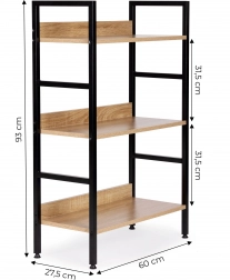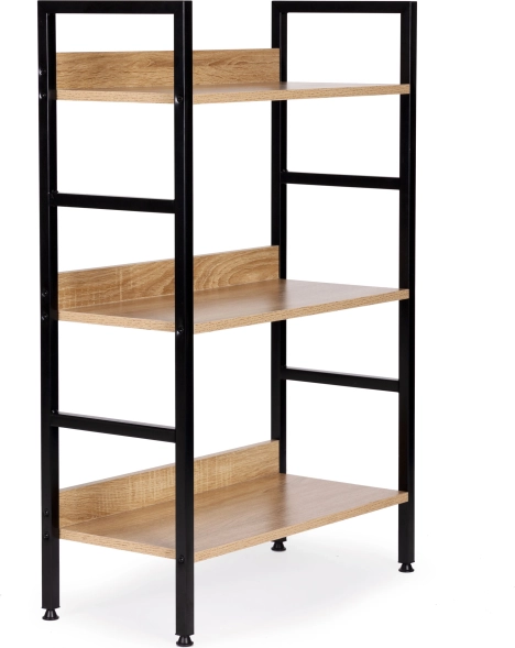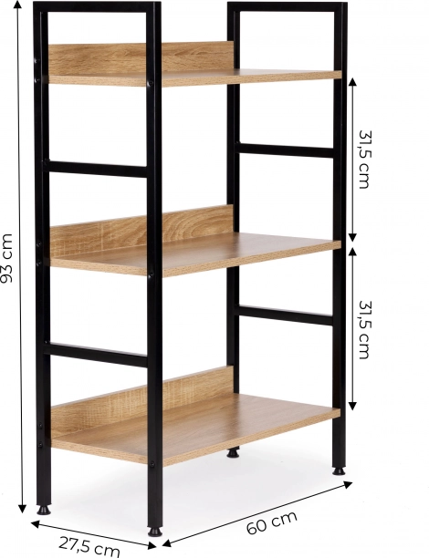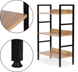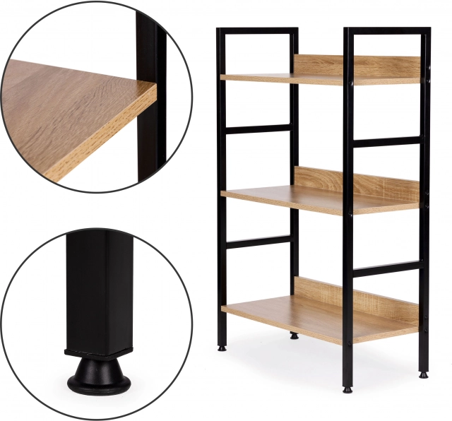 Stylová loftová police se třemi patry přináší moderní design, stabilní kovovou konstrukci a univerzální využití do obýváku, ložnice, předsíně i koupelny. Kvalitní MDF desky s dřevodekorem na pevném práškově lakovaném rámu, nastavitelné nožky s ochranou podlahy a snadná montáž z ní dělají ideální úložné řešení pro dekorace, knihy i rostliny.