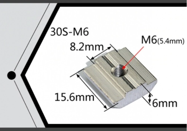 Praktická posuvná matice se závitem M6 o délce 30 mm pro snadné a pevné uchycení příslušenství k 3D tiskárnám, včetně modelů Rebel a Rebelix. Ideální pro montáž držáku na filamenty a další doplňky, zajišťuje spolehlivou fixaci a rychlou instalaci bez zbytečných komplikací.
