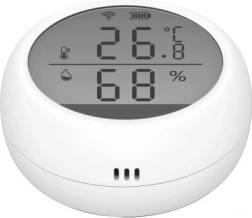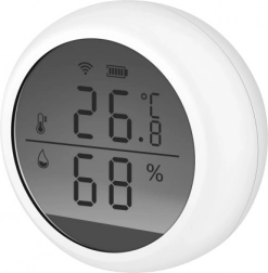 Velký segmentový LCD displej jasně ukazuje aktuální teplotu a relativní vlhkost, včetně ikon stavu Wi‑Fi a baterie. Ideální pro rychlou vizuální kontrolu klimatu v místnosti.