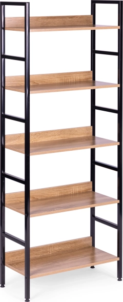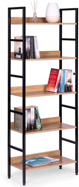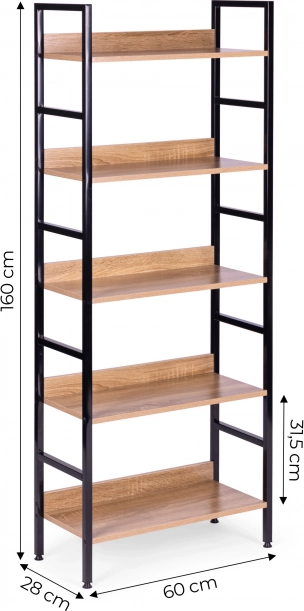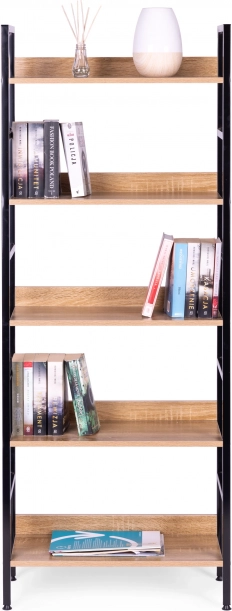 Poličky jsou vyrobeny z MDF desky, potažené dýhou imitující dřevo. Jejich rozměry 56 x 25,5 cm pohodlně pojmou všechny vaše oblíbené předměty. Rám knihovny je vyroben z práškově lakovaného kovu a jeho nohy jsou opatřeny speciálními nožičkami pro ochranu podlahy.