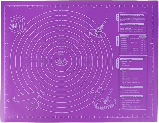 Praktická silikonová podložka na válení těsta o rozměrech 60 × 45 cm s laserově vyznačenou centimetrickou škálou a kruhovými průměry. Nabízí nepřilnavý povrch, snadné čištění a vysokou pružnost, díky níž ji snadno srolujete a uložíte. Laserové značení je výrazné a ploché, takže se neobtiskává do těsta. Upozornění: není vhodná do trouby ani mikrovlnné trouby.