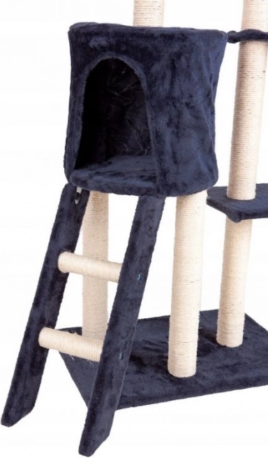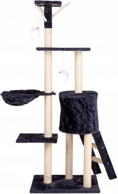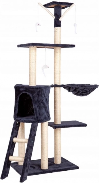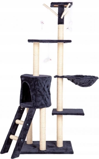 Promyšlené detaily, jako jsou čtyři závěsné hračky – myšky a praktický žebříček, podporují přirozené kočičí chování: skákání, lov, protahování i relax. Šedé provedení se snadno hodí do moderního interiéru a díky stabilní konstrukci se hodí i pro více koček.