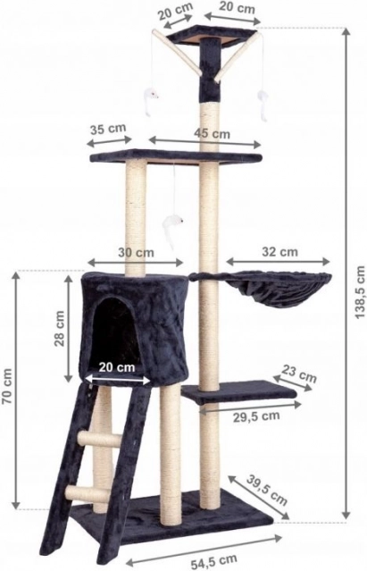 Dopřejte své kočce vlastní ráj na hraní i odpočinek. Toto vysoké škrabadlo o výšce 138 cm nabízí 5 úrovní zábavy, 3 vyhlídkové plošiny, prostorný domeček, houpací hamaku a čtyři závěsné myšky. Sloupky jsou omotané přírodním sisalem pro zdravé broušení drápků a celý strom je potažen měkkým plyšem pro maximální pohodlí. Stabilní konstrukce chrání váš nábytek a poskytuje kočkám bezpečný prostor ke šplhání, hraní i spaní.