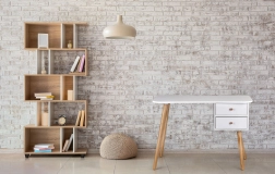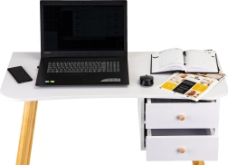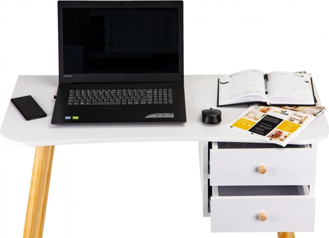 Bílá deska a přírodní dřevo vytváří moderní vzhled, který se hodí do kanceláře, studentského pokoje i ložnice – klidný, funkční a nadčasový.