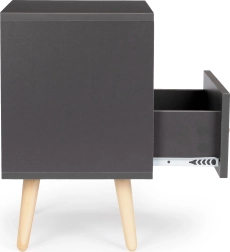 Elegantní noční stolek ModernHome je ideální volbou do moderních interiérů. Jeho čisté linie a univerzální šedý odstín se snadno kombinují s ostatním nábytkem. Díky kompaktním rozměrům nezabere mnoho místa, přesto nabídne překvapivě dost úložného prostoru.