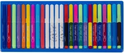 Obrázek ukazuje sadu barevných fixů organizovaných v modré plastové přihrádce. S různými barvami a uzávěry indikujícími barvu inkoustu nabízí široké možnosti pro kreativitu.
