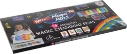 Obrázek ukazuje balení '25 Amazing Magic Changing Pens.' Balení zdůrazňuje živé barvy a speciální efekt měnících se barev, doplněné ilustracemi a fotografiemi ukazujícími použití per.