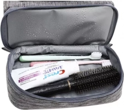 Taška je vyrobena z materiálů, které odpuzují vodu, což je ideální pro použití v koupelně nebo na cestách.