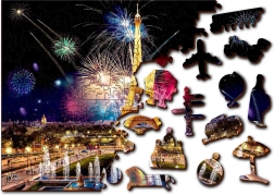 Puzzle je oboustranné (2v1): z jedné strany skládáte podle barevného motivu noční Paříže s ohňostrojem, z druhé podle opakujícího se vzoru jen podle tvarů dílků. Hladké hrany bez třísek zajišťuje precizní laserové zpracování a pevná HDF deska o síle 3–4 mm. V balení najdete také samostatnou předlohu pro pohodlnější skládání.