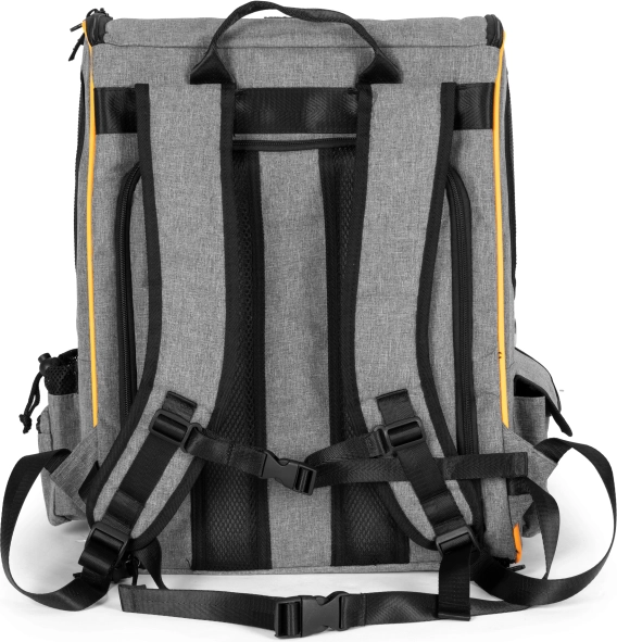 Pro pohodlné nošení nechybí široké polstrované ramenní popruhy doplněné hrudním a bederním pásem pro stabilitu. Uvnitř je měkká podložka a bezpečnostní karabina na obojek. Postranní kapsy pojmou vodítko, pamlsky či sáčky – jedna kapsa má praktický otvor pro snadné vytahování sáčků.