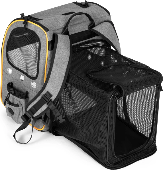Chytrá možnost rozšíření zadní části vytvoří zázemí pro odpočinek – malé „lehátko“, kde má zvíře více prostoru k ležení. Přístup zajišťují otevírací vstupní chlopně včetně horního zipového vstupu s rolovacím síťovaným krytem, takže mazlíčka snadno vložíte i vyjmete.