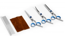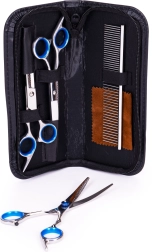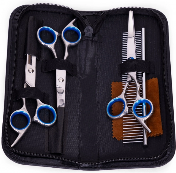 Udržujte srst svého mazlíčka v perfektní kondici s univerzální sadou PETSI. Tři precizní nůžky z nerezové oceli zajistí čistý a rovnoměrný střih, jemné prozesávání a ztenčování i styling citlivých partií kolem uší, tlapek a očí. Kovový hřeben s dvojí roztečí zubů si poradí s rozčesáním i finálním uhlazením srsti.
