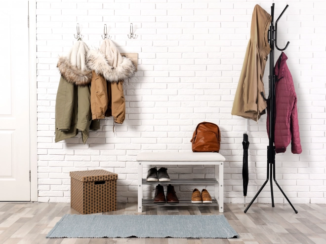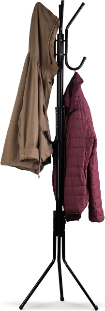 Elegantní stojanový věšák z odolného kovu nabízí 11 háčků pro přehledné uložení kabátů, kabelek i doplňků. Díky stabilní trojnožce a bezpečnostním koncovkám je ideální do předsíně, kanceláře i šatny. Klasický design snadno zapadne do každého interiéru a nižší háčky potěší i děti.