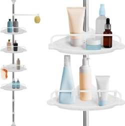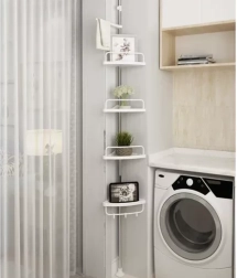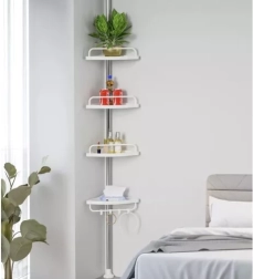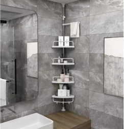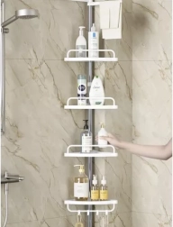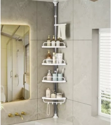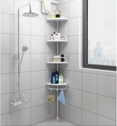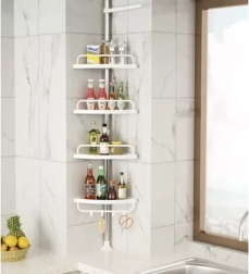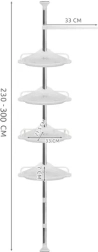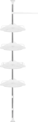 Udržte sprchu perfektně zorganizovanou a vše potřebné mějte vždy po ruce. Tato rohová sprchová police s rozpěrnou (teleskopickou) tyčí se snadno přizpůsobí výšce stropu v rozmezí 230–300 cm a díky chytrému rohovému provedení maximálně využije i malé prostory. Čtyři prostorné police doplňuje praktický věšák na houby či kartáče – ideální pro šampony, kondicionéry, mýdla i další kosmetiku.
