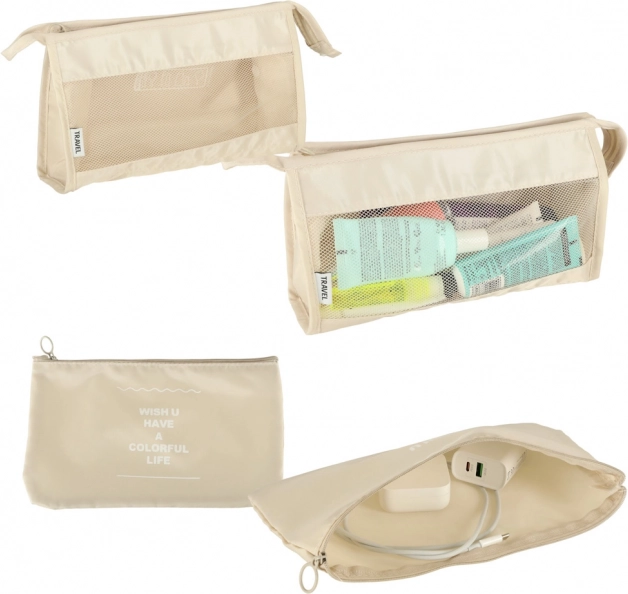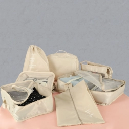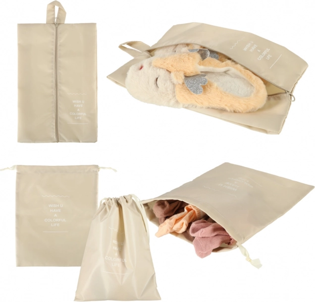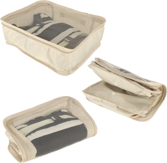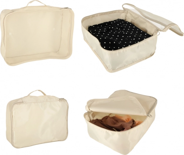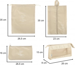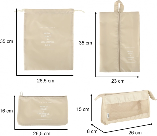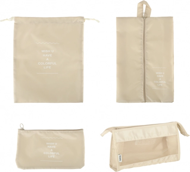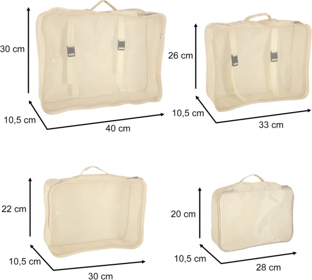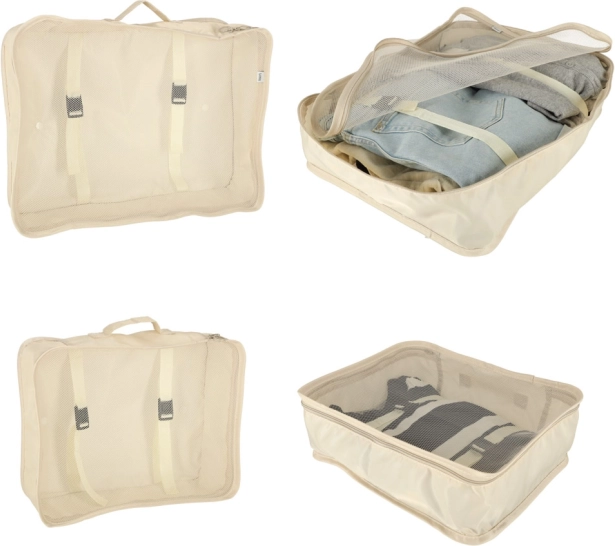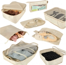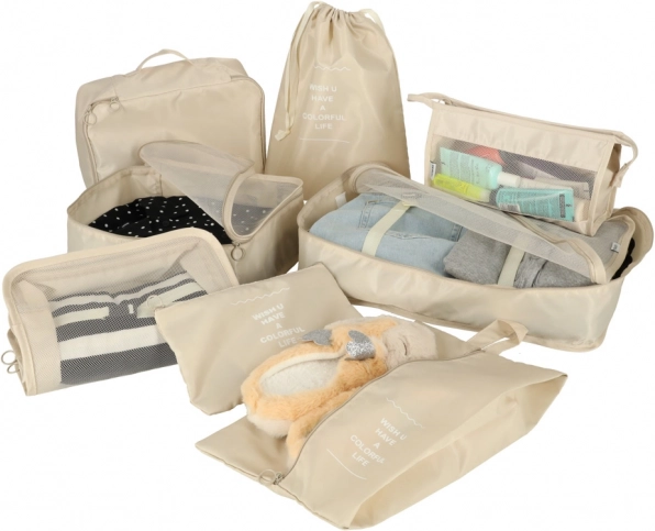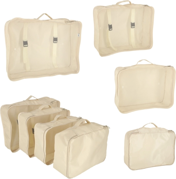 Udělejte si ve svých zavazadlech pořádek jednou provždy. Tento 8dílný set cestovních organizérů v elegantní béžové barvě nabízí čtyři kostky na oblečení, tašku na boty, kosmetickou taštičku, sáček se stahováním a malou kapsu na drobnosti. Díky lehké a odolné textilii z polyesteru jsou organizéry snadno omyvatelné, odolné proti nečistotám a perfektní pro přehledné balení na cesty i každodenní použití.