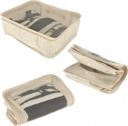 Organizéry jsou vyrobeny z lehkého a odolného polyesteru, který se snadno čistí a dobře odolává nečistotám. Set je ideální pro dovolené, služební cesty i domácí skladování.