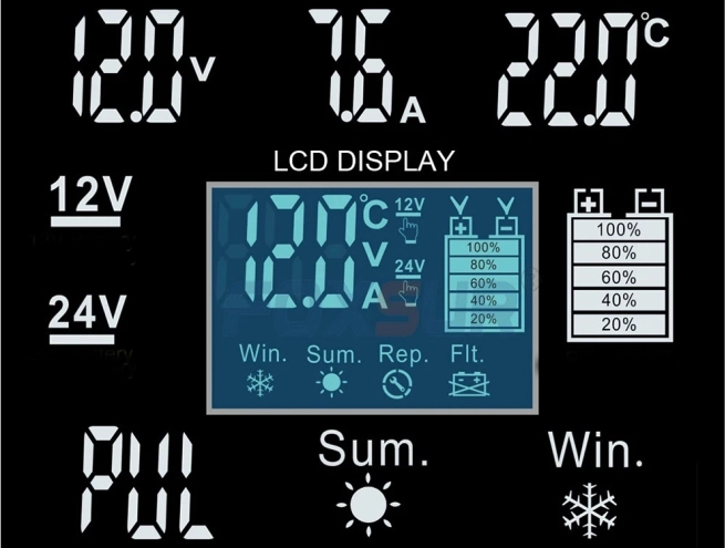- LCD indikátor stavu nabíjení, napětí a proudu