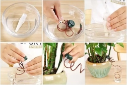 Namočte kužel na 15 minut do vody, naplňte hadici vodou a umístěte kužel do země. Zásobník na vodu by měl být výše než květináč pro zajištění stálého přísunu vody.