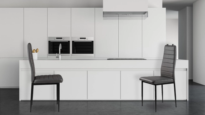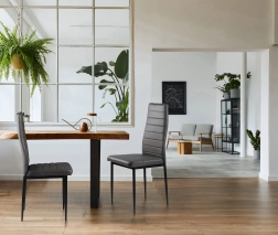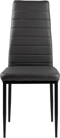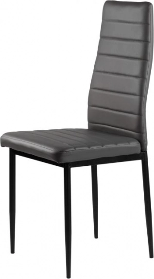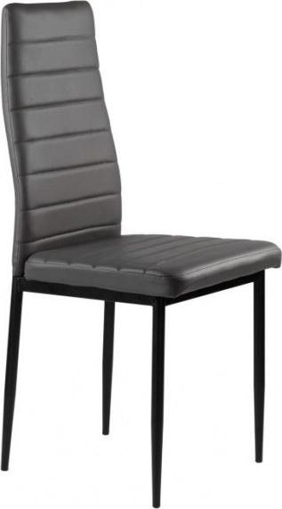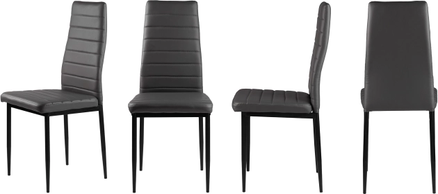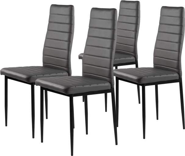 Tyto šedé židle jsou vyrobeny z měkké ekologické kůže a doplněny jednoduchými černými kovovými nohami, což jim dodává elegantní a moderní vzhled. Jsou navrženy tak, aby dobře vypadaly v jídelním nebo obývacím pokoji, a díky svému designu s vysokým opěradlem poskytují výjimečné pohodlí.