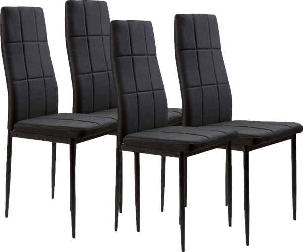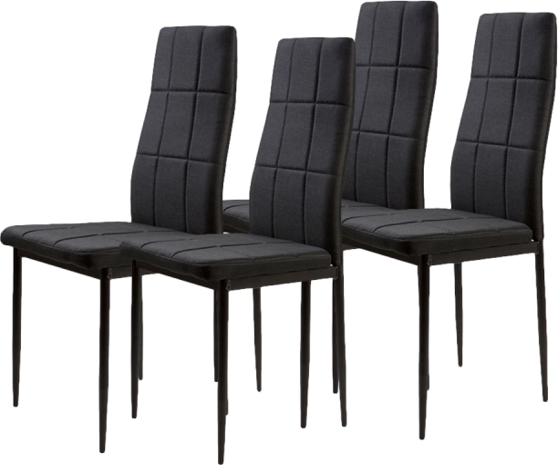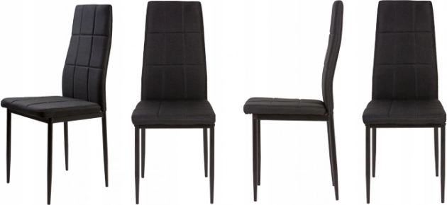 Sada čtyř černých čalouněných židlí od firmy ModernHome je dokonalým doplněním každého moderního interiéru. Komfortní opěradlo z měkké textilie a kvalitní pěnová výplň zaručují pohodlné sezení. Čalounění v černé barvě doplněné elegantním prošíváním snadno zapadne do jakéhokoliv zařízení.