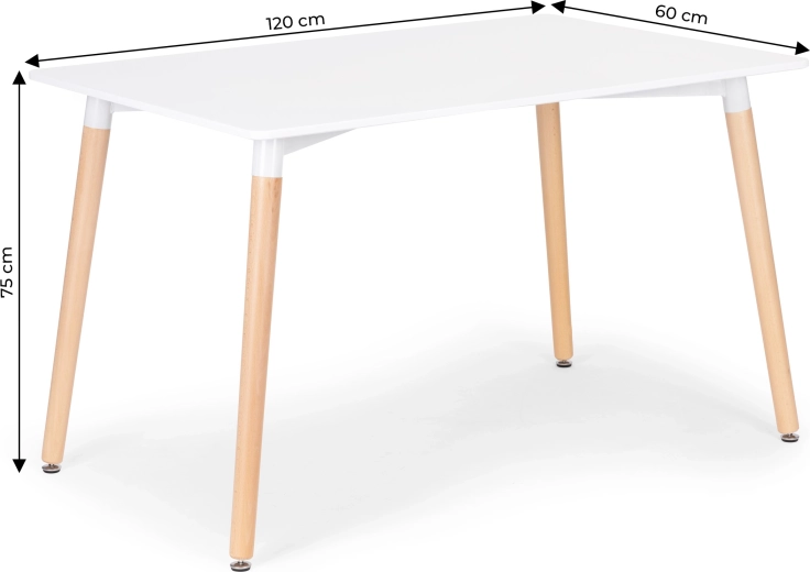 Elegantní stůl od značky ModernHome pro jídelnu, kuchyň i obývací pokoj s rozměry 120 × 60 cm. Kombinuje matně bílou desku, pevné dřevěné nohy a kovový rám pro maximální stabilitu. Díky univerzálnímu skandinávskému designu skvěle zapadne do moderních i klasických interiérů. Nechybí nastavitelné protiskluzové patky a odolné provedení pro každodenní používání.