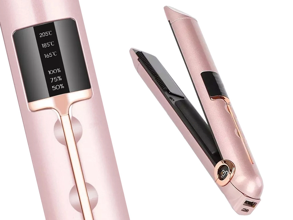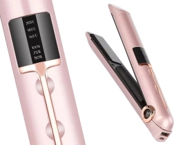 Objevte svobodu stylování bez kabelu. Keramické destičky se zahřívají rovnoměrně, chrání vlasy před poškozením a zanechávají je hladké a lesklé. Pomocí tří přednastavených teplot snadno přizpůsobíte péči jemným, barveným i hustým vlasům. LCD displej přehledně ukáže zvolenou teplotu i stav baterie.