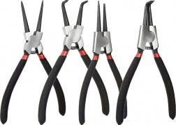 Praktická sada pro práci s pojistnými kroužky Seger obsahuje 4 ks kleští – 2× rovné a 2× zahnuté hroty pro vnitřní i vnější kroužky. Odolné provedení z kovu s ergonomickými, protiskluzovými rukojeťmi zajišťuje přesnou montáž i demontáž v autoservisu i dílně. Ideální pro mechaniky i domácí kutily, kteří vyžadují spolehlivost, přesnost a pohodlné používání.