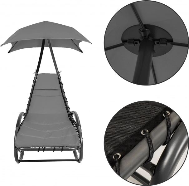 Tento výrobek je vybaven nastavitelným baldachýnem, který poskytuje příjemný stín během horkých dnů. Díky solidnímu ocelovému rámu je zajištěna vysoká stabilita a bezpečnost. Potah z vodotěsného materiálu garantuje snadnou údržbu a dlouhou životnost.