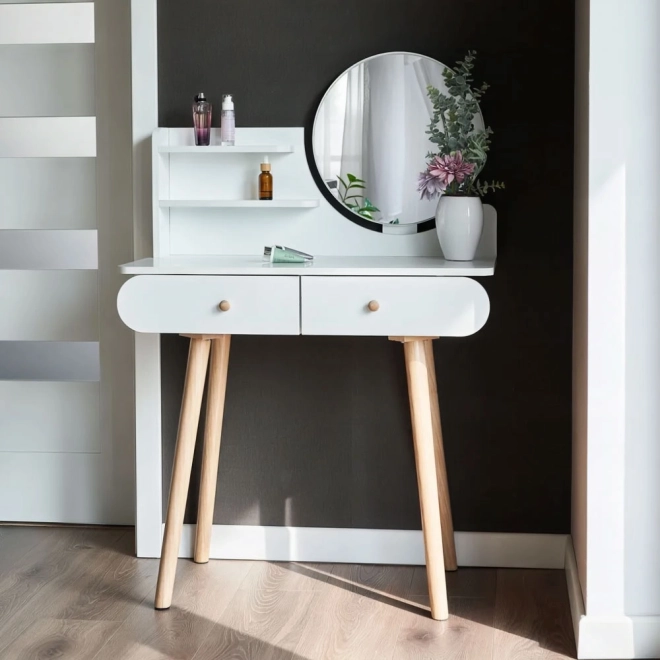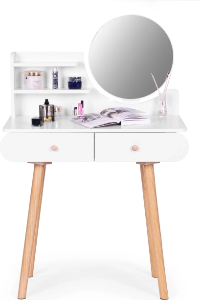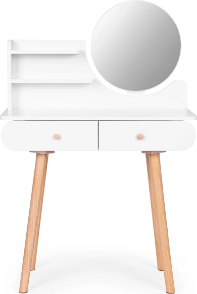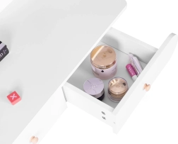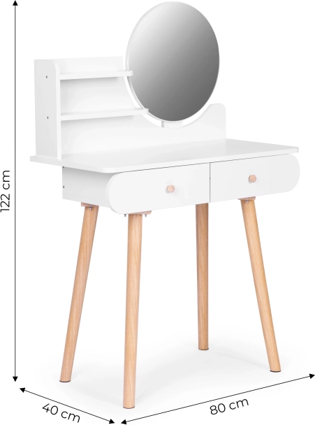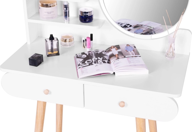 Stolek je vybaven kulatým zrcadlem o rozměrech 40x40 cm a dvěma velkými zásuvkami, které nabízejí dostatek místa pro vaše kosmetické přípravky.