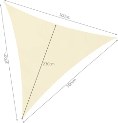 Praktická trojúhelníková sluneční plachta o rozměru 3 × 3 × 3 m v elegantní béžové barvě přináší spolehlivý stín a ochranu před UV zářením. Je vyrobena z odolného polyesteru s gramáží 120 g/m², je voděodolná, rychleschnoucí a umožňuje volnou cirkulaci vzduchu. Díky kroužkům z nerezové oceli a přiloženým šňůrám ji snadno upevníte na zahradě, terase, balkonu i na kempování.