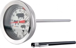 Teploměr obsahuje symboly pro optimální teploty různých druhů masa a čitelný ciferník.