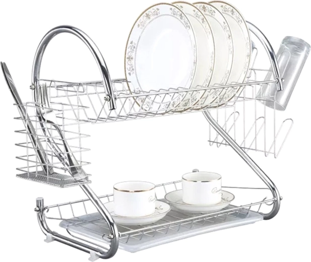 Praktická dvoupatrová sušička na nádobí se stabilní chromovanou konstrukcí a odkapávací plastovou tácem udrží vaši kuchyň v perfektním pořádku. Horní patro pojme až 15 talířů, spodní je ideální pro sklenice a hrnky. Součástí je vyjímatelný košík na příbory a vnější věšák až na 6 sklenic.
