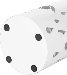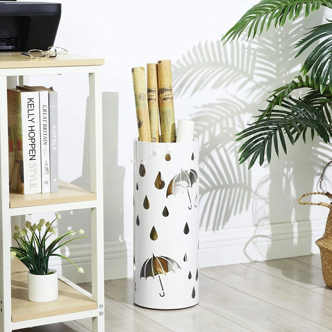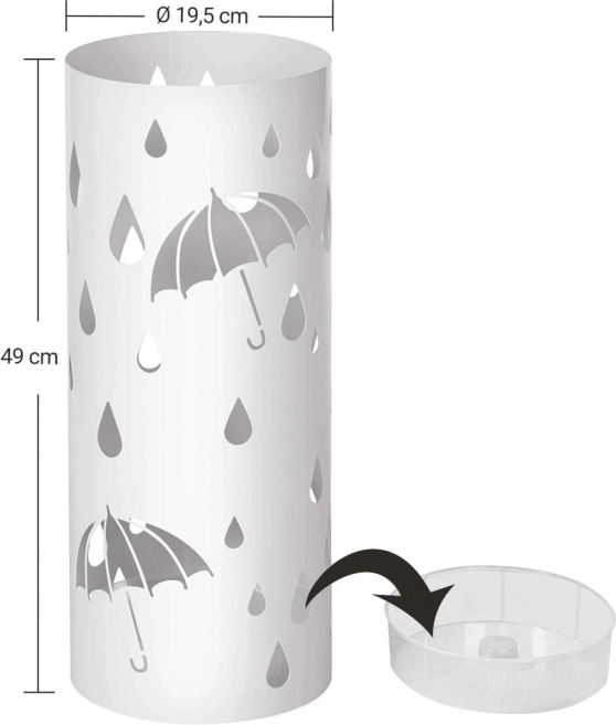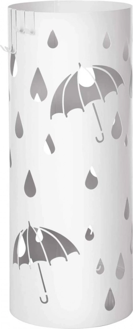 Elegantní bílý stojan na deštníky je ideálním doplňkem do vaší domácnosti. Moderní design a otevřená kovová konstrukce dodává stylový vzhled a zaujme každého návštěvníka. Bílá barva a dekorativní výřezy deštníků a kapek deště doplňují vzhled každého vchodu či chodby.