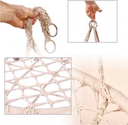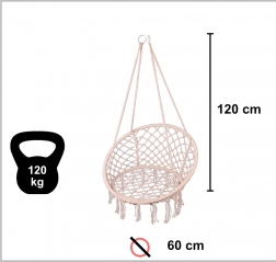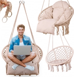 Toto závěsné houpací křeslo přináší pohodlné posezení pro chvíle odpočinku i jemného houpání. Velký kruhový tvar a měkký polštář podporují ergonomickou polohu těla, zatímco pevné bavlněné lanové výplety a kovový rám dodávají jistotu a dlouhou životnost.