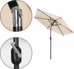 Velký zahradní slunečník 270 cm s možností naklápění a pohodlným otevíráním na kliku zajistí příjemný stín na terase, zahradě i balkonu. Odolný polyester 160 g/m² chrání před sluncem i lehkým deštěm, větrací otvor zlepšuje proudění vzduchu a stabilní ocelová konstrukce se 6 rameny garantuje spolehlivost. Elegantní béžová barva snadno ladí s venkovním nábytkem.