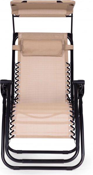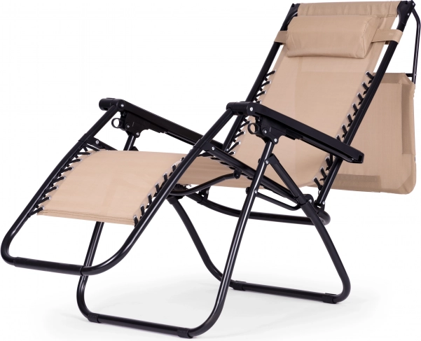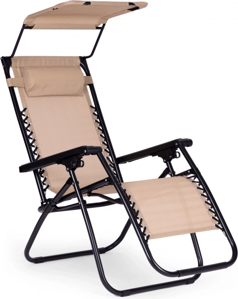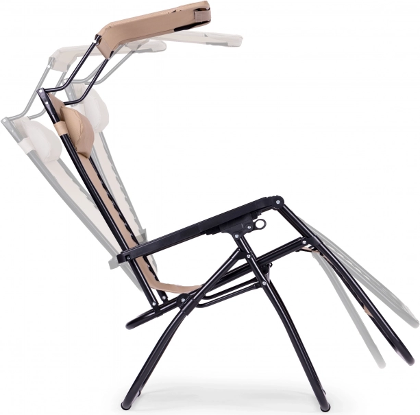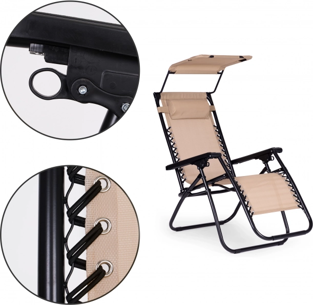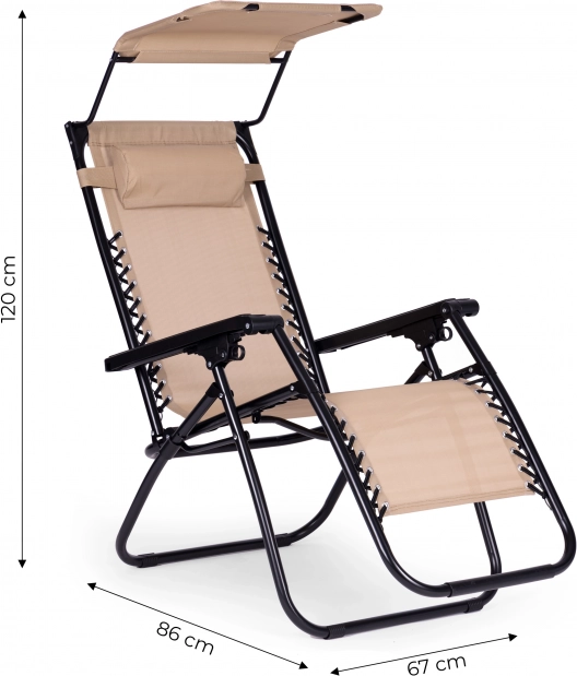 Užijte si relax na zahradě, terase i na pláži s tímto pohodlným lehátkem ve stylové béžové barvě. Nabízí plynulé polohování až do pozice beztíže, nastavitelnou sluneční stříšku, měkký podhlavník a skládací konstrukci pro snadné přenášení. Odolný ocelový rám s protiskluzovými koncovkami a voděodolná textilie zaručují komfort i dlouhou životnost. Maximální nosnost 120 kg.