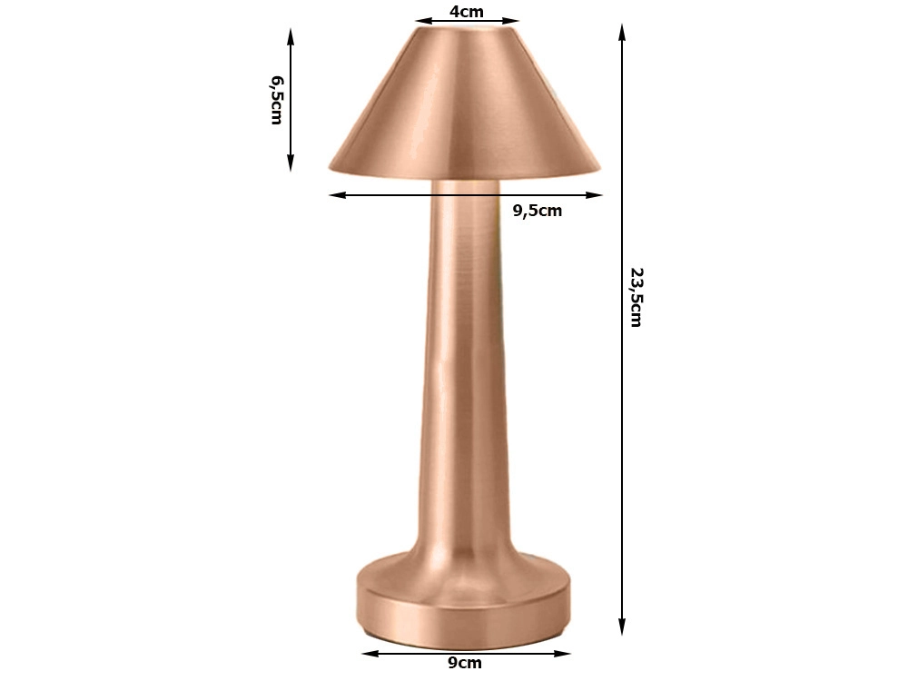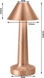 Lampa je bezdrátová – napájí ji vestavěná baterie 1500 mAh, kterou dobijete pomocí USB‑C kabelu (součást balení). Úsporné LED se postarají o dlouhou životnost a nízkou spotřebu. Díky kompaktním rozměrům a kovovému provedení v měděné barvě se hodí na noční stolek, pracovní desku i do čtecího koutku.