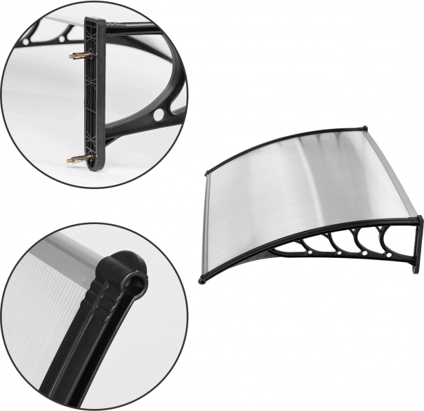 Konstrukce je tvořena odolnými plastovými konzolemi a dutinkovým polykarbonátem o tloušťce 0,5 cm. Promyšlený sklon a tvar profilů zajišťují plynulý odtok vody a sněhu, takže se stříška nepřetěžuje a zůstává stabilní i při silném větru. Modulární systém umožňuje napojení více kusů do delšího přístřešku.