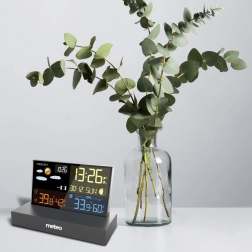 Meteostanice METEO SP110C nabízí komplexní přehled o počasí a klimatu v domácnosti. Bezdrátové čidlo přenáší data o teplotě a vlhkosti až na vzdálenost 60 m, barevný displej s přehlednými ikonami zobrazuje předpověď na 12–24 hodin, fáze Měsíce i trend tlaku z integrovaného barometru. Díky DCF radiem řízeným hodinám máte vždy přesný čas, budík se snooze funkcí zpříjemní každé ráno.