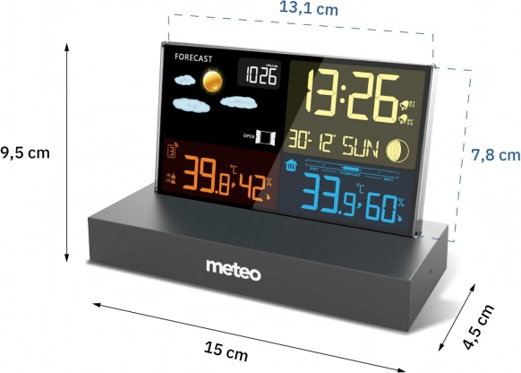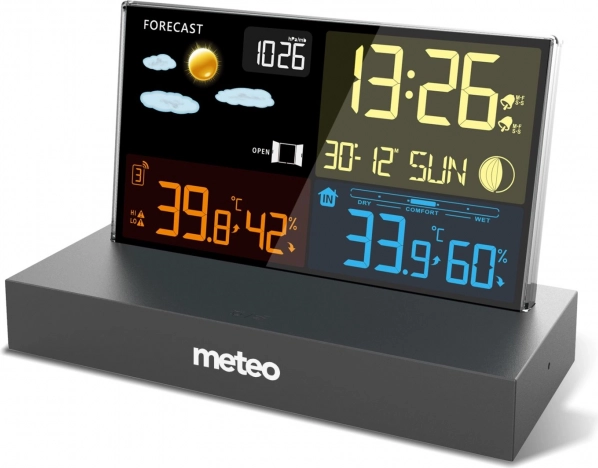 Meteostanice zobrazuje teplotu, vlhkost, tlak a předpověď pomocí výrazných ikon, takže jedním pohledem víte, jak bude.