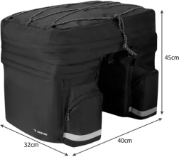 Tato brašna je vybavena třemi hlavními komorami s celkovou kapacitou 60 litrů, dostatečnou k přepravě nejen občerstvení a oblečení, ale také cenností jako je notebook nebo dokumenty formátu A4. Je perfektní pro městské jízdy i delší cyklovýlety.