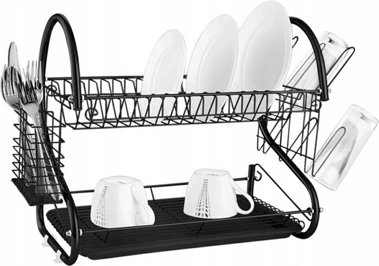 Praktická dvouúrovňová odkapávačka na nádobí se samostatným košíkem na příbory a odkapávací miskou zajistí pořádek po každém mytí. Na horní úrovni pojme až 15 talířů, spodní patro je ideální na sklenice a hrnky. Stabilní konstrukce ze nerezové oceli v elegantní černé barvě a kompaktní rozměry pro snadné uložení do skříňky.