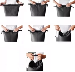 Srolujte okraj alespoň třikrát a sepněte přezku – jednoduché a účinné utěsnění proti vodě i náhodnému otevření.