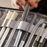 Uvnitř najdete 6 síťovaných kapes pro rychlý přehled a 8 elastických gum pro pevné zajištění příslušenství. Zipové zapínání chrání obsah, pěnové polstrování tlumí nárazy a poutko na zápěstí usnadňuje přenášení. Vhodné pro práci, studium i cestování.