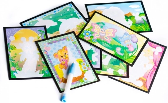 Postup: Otevřete kouzelnou tužku, naplňte ji vodou a uzavřete. Přetírejte patřičné části obrázků, dokud se nevybarví. Pro menší děti lze použít i obyčejný štětec a kelímek s vodou.