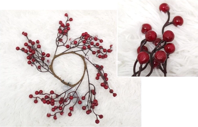 Ozdobný věnec s červenými kuličkami, ideální pro vytvoření sváteční atmosféry. Má prostor pro umístění svíčky o průměru 10 cm a šířku 30 cm, což dodává prostoru eleganci a teplo. Perfektní pro dekoraci během svátků i po celý rok.